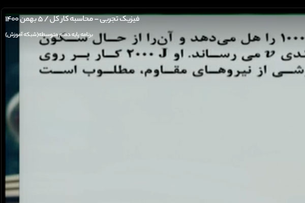 پایه دهم متوسطه(شبکه آموزش) فیزیک تجربی - محاسبه کار کل / 5 بهمن 1400 پایه 10 متوسطه علوم تجربی پنج شنبه 4 فروردین 1401 ادامه...