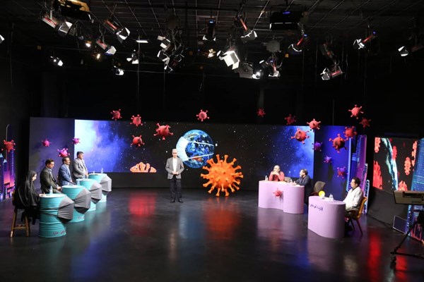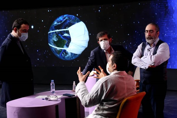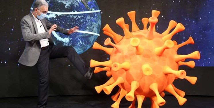 اینجا همه چیز کرونایی شده و ویروس همه جا منتشر شده است! در حقیقت دکور برنامه متشکل از تصویری از کهکشان هاست و در داخل استودیو هم ماکت هایی از ویروس در اندازه های مختلف ساخته شده و از سقف آویزان شده اند. البته چند ویروس بزرگ تر هم هستند که به رنگ قرمز درآمده اند و اتفاقا رضا رفیع هم با آنها سر شوخی دارد.